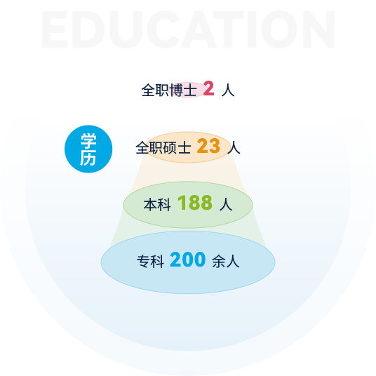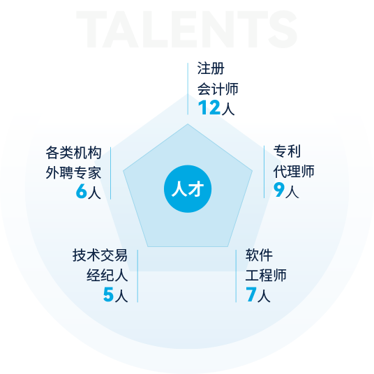 截止2024年,公司擁有各類(lèi)人才400余人,其中全職博士2人,全職碩士23人,本科188人,專(zhuān)科200余人,注冊會(huì )計師12人,專(zhuān)利代理師9人,軟件工程師7人,技術(shù)交易經(jīng)紀人5人,南京企服中心等各類(lèi)機構外聘專(zhuān)家6人,公司還和南京大學(xué)、東南大學(xué)、南京農業(yè)大學(xué)、南京信息工程大學(xué)、南通大學(xué)、江蘇開(kāi)放大學(xué)等建立了良好的合作關(guān)系。